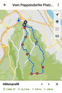 Strecke: Die Wanderung geht vom Poppelsdorfer Platz hoch zum Venusberg, weiter zur Waldau und über das schöne Melbtal zurück zum Clemens-August-Platz. Es werden max. 12 km, die Route kann aber nach Bedarf verkürzt werden.